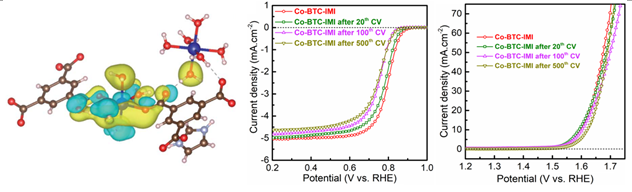 純相金屬有機(jī)骨架(MOFs)在催化領(lǐng)域具有巨大的應(yīng)用潛力,但是由于這類材料的導(dǎo)電性不夠高,在能源轉(zhuǎn)換和存儲電催化領(lǐng)域中應(yīng)用受到的限制。銀鳳翔、陳標(biāo)華課題組理論計算研究發(fā)現(xiàn),MOFs中的不飽和配位能降低空間位阻,促進(jìn)活性中心與水分子和氧氣分子的相互作用,降低電子傳導(dǎo)阻力,提高材料的導(dǎo)電性,使得這種MOFs在電催化中具有增強(qiáng)的質(zhì)量傳遞和電子傳遞特性。根據(jù)這一發(fā)現(xiàn),課題組采用鈷離子、均苯三甲酸和咪唑通過水熱反應(yīng)合成了金屬有機(jī)骨架Co-BTC-IMI,該材料中的一個Co離子分別被兩個去質(zhì)子化的均苯三甲酸連接,構(gòu)建了Co金屬中心的不飽和配位。該金屬有機(jī)骨架在堿性半電池中可提供0.80 V(參比可逆氫電極)的氧氣還原反應(yīng)半波電勢,并在10 mA·cm-2電流密度下提供了1.59 V(參比可逆氫電極)的氧氣析出反應(yīng)電勢。該工作在將純相MOFs直接應(yīng)用于氧氣電催化領(lǐng)域中取得了突破性進(jìn)展,為能源轉(zhuǎn)換和存儲科學(xué)和技術(shù)的發(fā)展提供了新的思路。近日,該成果已經(jīng)發(fā)表于國際頂級期刊Journal of Materials Chemistry A上。此項工作得到了江蘇省綠色催化重點實驗室、江蘇省自然科學(xué)基金以及國家自然科學(xué)基金的資助。