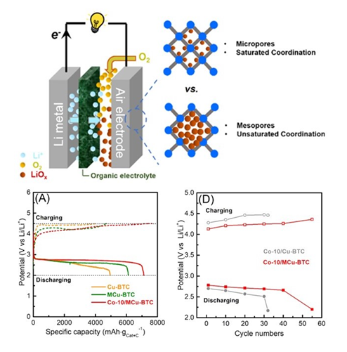 純相金屬-有機(jī)骨架(MOFs)具有超高的比表面積和較高活性的金屬中心,在鋰-空氣電池催化領(lǐng)域中有巨大的應(yīng)用潛力。然而這類材料的微孔特性限制了鋰-空氣電池的充放電容量。為解決這一問題,銀鳳翔、陳標(biāo)華課題組開發(fā)了一種部分移除配位官能團(tuán)的方法,在Cu離子與均苯三甲酸配位過程中引入間苯二甲酸,從而在微孔Cu-MOF中構(gòu)造了大量的介孔以及具有不飽和配位的Cu金屬中心。通過實(shí)驗(yàn)及理論計(jì)算研究表明,在電催化過程中,大量的介孔以及不飽和配位的Cu金屬中心可以有效降低空間位阻從而增強(qiáng)傳質(zhì),降低電子傳導(dǎo)阻力,提高與反應(yīng)物之間的親和力,同時(shí)為不溶性鋰-空氣電池放電產(chǎn)物Li2O2提供更多的存儲(chǔ)空間。在該介孔Cu-MOF上負(fù)載Co后,最為優(yōu)化的催化劑在鋰-空氣電池中可產(chǎn)生近7000mAh/g的放電容量;在1000mAh/g放電容量時(shí),可以穩(wěn)定充放電循環(huán)55圈,而使用微孔Cu-MOF的催化劑在相同條件下只能穩(wěn)定32圈。