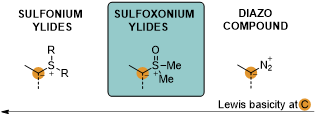 锍葉立德作為兩性離子化合物,一般需要在葉立德Cα-位引入吸電子基來穩(wěn)定其存在。此外,根據(jù)硫原子氧化態(tài)的不同,可以分為sulfonium ylide(正锍葉立德)與sulfoxonium ylide(氧化锍葉立德)兩大類。電負(fù)性氧原子的引入,不僅使得氧化锍葉立德的葉立德碳Lewis堿性降低,而且具Lewis堿性的氧原子或副產(chǎn)物DMSO容易與手性催化劑結(jié)合,從而可能對反應(yīng)過程中的手性誘導(dǎo)產(chǎn)生干擾。但與正锍葉立德以及類似的重氮化合物相比,氧化锍葉立德具有良好的穩(wěn)定性,之前報道的絕大多數(shù)文獻都將其作為重氮化合物的替代物經(jīng)金屬卡賓中間體應(yīng)用于有機合成。因此,發(fā)展基于锍葉立德不對稱催化研究具有重要意義。