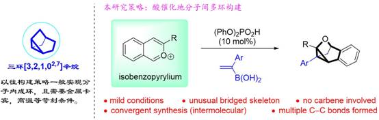 近日,黃海教授與孫建偉教授課題組在Angew. Chem. Int. Ed.上發(fā)表題為“A Mild Intermolecular Synthesis ofCyclopropane-Incorporated Tricyclic Skeleton: Unusual Reactivity of Isobenzopyryliums”的研究論文。復雜的結(jié)構(gòu)骨架,特別是帶有張力小環(huán)的骨架結(jié)構(gòu)是天然產(chǎn)物較為多見的母體結(jié)構(gòu),但是由于結(jié)構(gòu)的復雜性和不穩(wěn)定性,這一類骨架的構(gòu)建一直以來是具有挑戰(zhàn)性的工作。例如,三環(huán)[3,2,1,02,7]辛烷就是這樣一類復雜又帶有張力小環(huán)的骨架結(jié)構(gòu),以往的構(gòu)建策略都需要涉及金屬卡賓、高溫等苛刻反應(yīng)條件來克服動力學或熱力學不利的問題。本論文實現(xiàn)了一種在普通酸催化下的苯并異吡喃鹽與烯基硼酸連續(xù)[4+2]環(huán)加成/關(guān)環(huán)反應(yīng),成功構(gòu)建了氧雜三環(huán)[3,2,1,02,7]辛烷骨架結(jié)構(gòu)。該類結(jié)構(gòu)預(yù)計在藥物分子中具有潛在的應(yīng)用價值。同時,后期合成應(yīng)用顯示,目標分子具有很高的合成價值,是一類不可或缺的骨架結(jié)構(gòu)。
