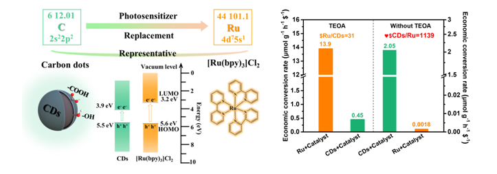 課題組基于MOFs材料構(gòu)建“多核殼催化劑”,由ZIF-67@MIL-68(In)誘導生成CDs/Co3O4/In2O3納米管。研究發(fā)現(xiàn),CDs(碳點)基催化劑在不添加犧牲劑TEOA(三乙醇胺)的條件下,光催化CO2還原性能優(yōu)于吡啶釕基催化劑。在這一體系中,碳點可以有效替代貴金屬催化劑取得良好的光催化性能。此項研究得到了江蘇省優(yōu)秀青年基金,國家自然科學基金的支持。