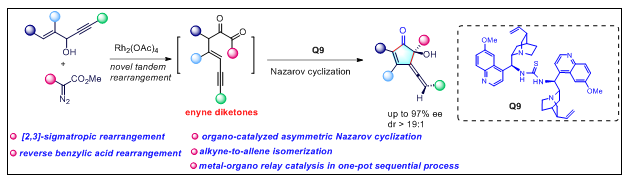我們發(fā)展了一種金屬-有機(jī)接力催化策略即:金屬銠催化重氮和烯炔醇經(jīng)過串聯(lián)重排反應(yīng)得到烯炔二酮(enyne diketones), 烯炔二酮作為新穎的Nazarov反應(yīng)底物在手性催化劑的催化下,高對映和非對映選擇性制備一系列手性聯(lián)烯環(huán)戊烯酮。
