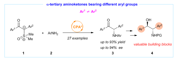 在進行上述卡賓捕獲反應(yīng)時,我們發(fā)現(xiàn)之前從未應(yīng)用于不對稱催化反應(yīng)的兩側(cè)含芳基取代的氧化硫葉立德1在手性酸催化下可順利進行N-H插入反應(yīng)而獲得alpha-氨基酮3,文獻中已報道的該類型alpha-氨基酮的有效的不對稱催化合成方法很少,究其原因在于手性中心的不穩(wěn)定。基于此,我們通過手性磷酸催化的氧化硫葉立德的不對稱N-H插入反應(yīng)實現(xiàn)了該類氨基酮的不對稱催化合成。我們的方法尤其適合于合成含不同芳基取代基的alpha-氨基酮3,其在藥物合成,配體設(shè)計,手性輔基設(shè)計等領(lǐng)域具有重要的應(yīng)用價值。