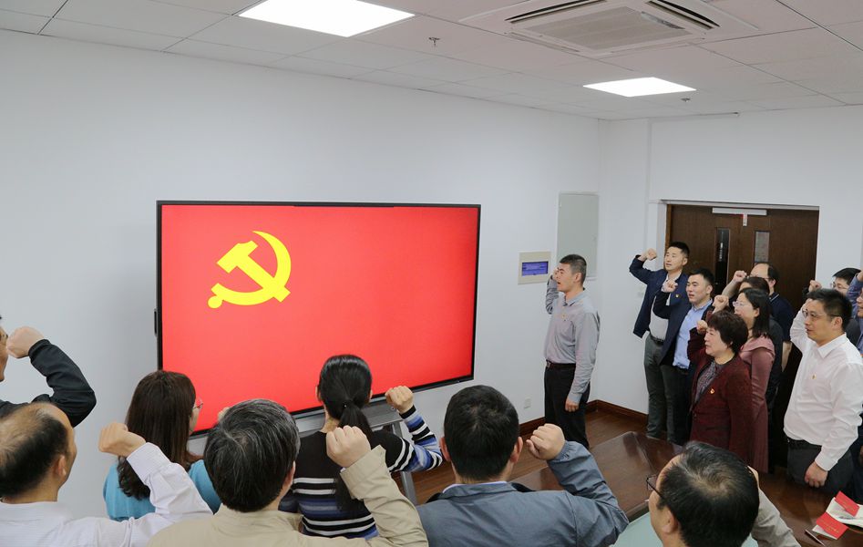 在集中學(xué)習(xí)黨章前,學(xué)習(xí)小組成員面向黨旗,重溫入黨誓詞。