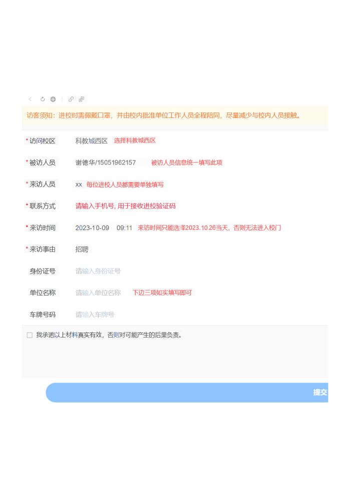 ③信息填寫完畢后點(diǎn)擊提交,審核通過后將收到預(yù)約信息登記成功短信并附帶入校鏈接,入校時(shí)請點(diǎn)擊鏈接生成入校二維碼并向門衛(wèi)出示即可。