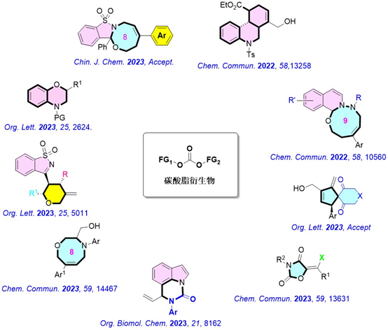 碳酸酯作為一類(lèi)重要的有機(jī)合成砌塊,在有機(jī)雜環(huán)化合物合成領(lǐng)域具有重要的戰(zhàn)略意義,為很多重要的雜環(huán)化合物分子提供了高效的合成方法。近兩年,孫建偉和黃海團(tuán)隊(duì)圍繞核心分子骨架高效構(gòu)建,針對(duì)于碳酸酯類(lèi)衍生物開(kāi)展了系列的精準(zhǔn)轉(zhuǎn)化研究,包括:對(duì)映選擇性環(huán)加成反應(yīng)、可控性分子內(nèi)環(huán)合反應(yīng)、連續(xù)多環(huán)化反應(yīng)等轉(zhuǎn)化類(lèi)型,為包括中環(huán)化合物等在內(nèi)的10余種重要雜環(huán)化合物提供的高效構(gòu)建策略。相關(guān)成果發(fā)表在Org. Lett.; Chem. Commun.; Chin. J. Chem.等知名期刊上。