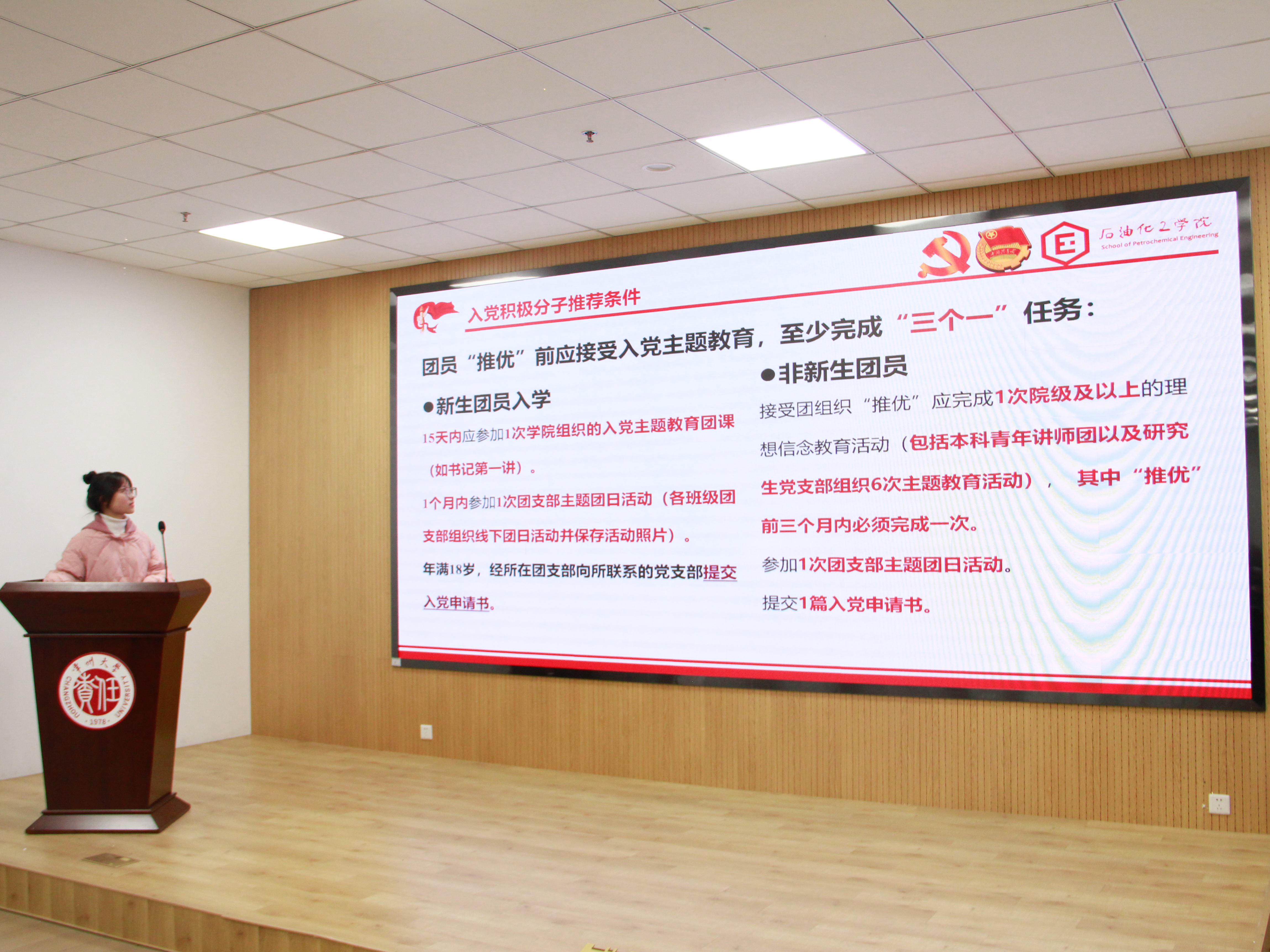 首先,余琳琳概述了常州大學共青團推優(yōu)入黨工作實施辦法,并詳細介紹了入黨積極分子和發(fā)展對象的推薦條件及推優(yōu)工作程序。隨后,晏春風根據《常州大學發(fā)展黨員工作實施細則》向同學們介紹了黨員發(fā)展流程和入黨材料填寫要求。最后,趙彩霞對黨員發(fā)展的時間線做進一步梳理和總結,鼓勵團員們向身邊的黨員看齊,積極發(fā)揮先鋒模范作用。勤奮科研,提高創(chuàng)新能力,力爭將所學所專與國家需求相結合;甘于奉獻,增強服務意識,主動為周邊老師同學等提供幫助支持,以實際行動向黨組織靠攏。
