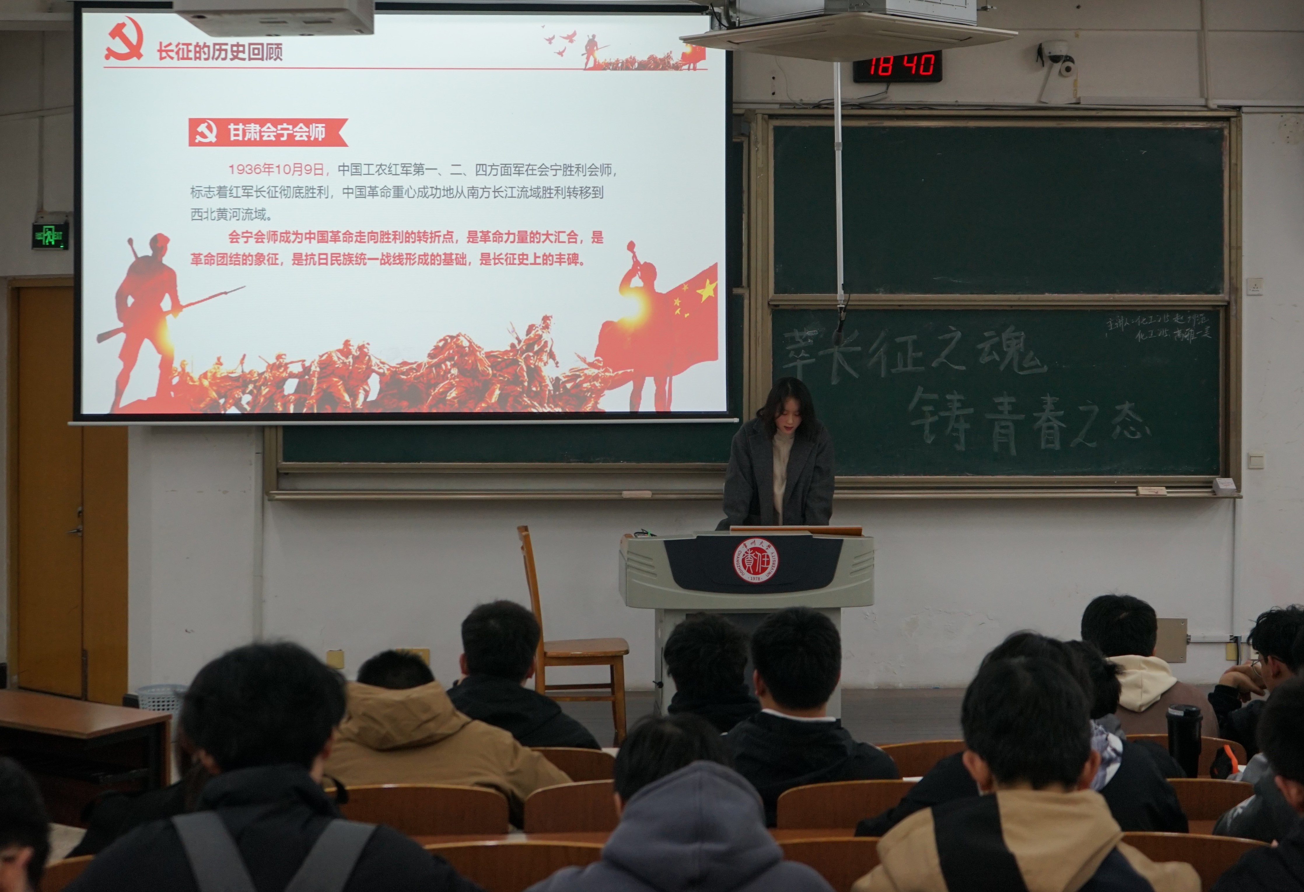 為弘揚(yáng)黨的優(yōu)良傳統(tǒng)和精神財(cái)富,增強(qiáng)民族凝聚力和自豪感,我院于3月27日18:30在W15階教舉辦“青年講師團(tuán)”系列講座——“萃長(zhǎng)征之魂,鑄青春之態(tài)”。本次講座由我院學(xué)生第一黨支部黨員趙坤范、高雅一美主講,各年級(jí)學(xué)生代表參加。