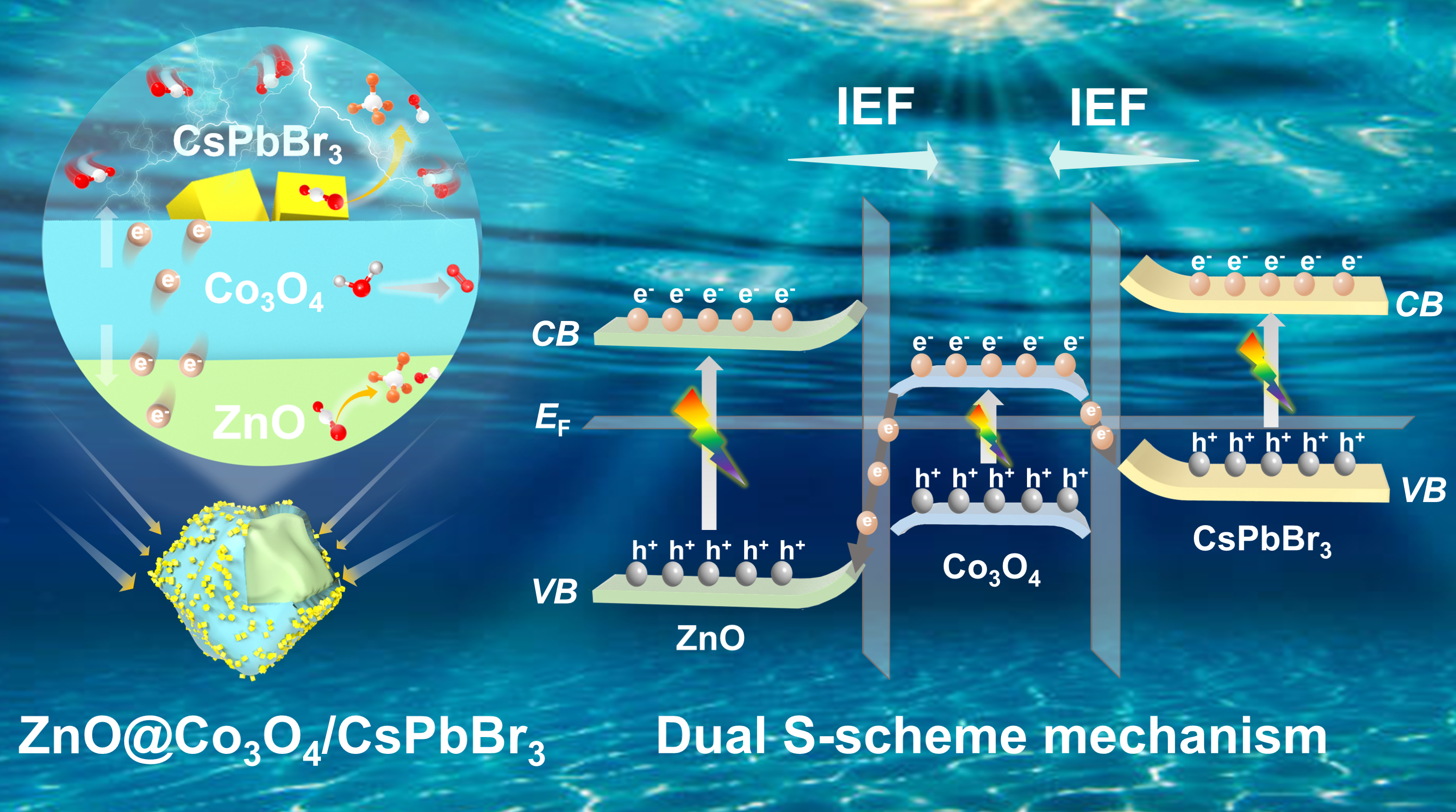 在前期工作基礎上(J. Mater. Chem. A, 2022, 10, 24519-24528;Chem. Eng. J. 2023, 475, 146385),同時通過合理設計具有強內(nèi)建電場和高氧化還原能力的S型異質(zhì)結(jié)的啟發(fā),課題組制備MOFs衍生的ZnO@Co3O4/CsPbBr3多殼層催化劑在不使用犧牲劑和光敏劑的情況下,最佳光催化劑CH4產(chǎn)率為238.8 μmol g-1 h-1,選擇性高達90.9%。相關工作以:“Internal electric field-modulated dual S-scheme ZnO@Co3O4/CsPbBr3 nanocages for highly active and selective photocatalytic CO2 reduction”為題發(fā)表在Journal of Catalysis上 (J. Catal. 2024, 435, 115574, doi:10.1016/j.jcat.2024.115574)