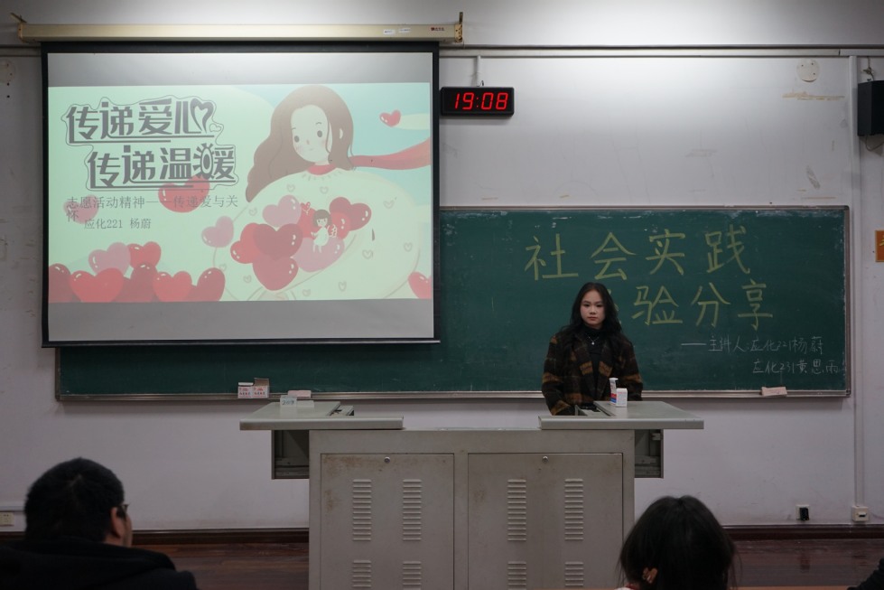 為了增強(qiáng)學(xué)生對(duì)社會(huì)實(shí)踐的興趣,培養(yǎng)學(xué)生無(wú)私奉獻(xiàn)、關(guān)愛(ài)他人的精神,我院于11月19日在W1209開(kāi)展“石化青年說(shuō)”系列講座第三講——社會(huì)實(shí)踐經(jīng)驗(yàn)分享。本次講座由應(yīng)化221楊蔚、應(yīng)化231黃思雨主講,我院學(xué)生代表參加。