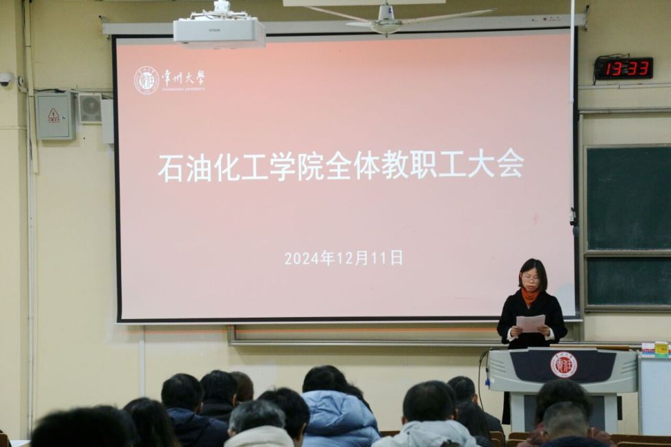 12月11日下午,石油化工學(xué)院在教學(xué)樓W6階召開2024年教職工大會(huì)暨學(xué)院工會(huì)會(huì)員大會(huì),學(xué)院黨政領(lǐng)導(dǎo)、分工會(huì)主席以及全體教職工參加會(huì)議,黨委副書記劉國仕主持會(huì)議。