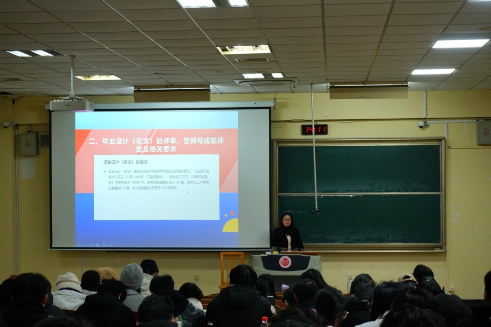 為助力畢業(yè)生準(zhǔn)確地把握畢業(yè)環(huán)節(jié)要求,切實確保高質(zhì)量完成此項重要學(xué)業(yè)任務(wù),我院于12月23日在W1階教開展2025屆本科畢業(yè)生畢業(yè)宣講活動,學(xué)院黨委副書記劉國仕、副院長黃薇、實踐教學(xué)秘書周正妹、專業(yè)負(fù)責(zé)人、本科生輔導(dǎo)員以及全體畢業(yè)生參加。