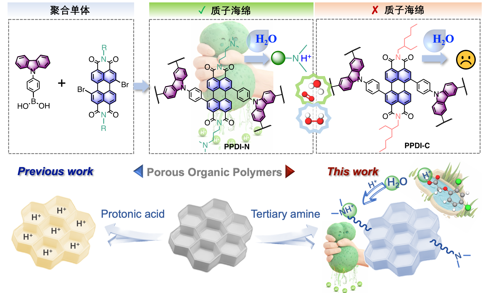 光催化生產(chǎn)過(guò)氧化氫(H2O2)過(guò)程中,主導(dǎo)催化效率的氧還原反應(yīng)(ORR)所需的質(zhì)子(H+)僅來(lái)自于水氧化反應(yīng)(WOR),但WOR動(dòng)力學(xué)卻遠(yuǎn)弱于ORR。因此,如何加速WOR產(chǎn)生更多H+,以滿足ORR的動(dòng)力學(xué)需求,是提升光催化產(chǎn)H2O2速率的關(guān)鍵。近日,顧培洋教授團(tuán)隊(duì)和李忠玉教授團(tuán)隊(duì)合作,提出了“質(zhì)子海綿”這一概念(圖1),基于苝酰亞胺,制備了一種二甲氨基修飾的共軛微孔聚合物(CMPs)催化材料,在該領(lǐng)域取得重要進(jìn)展: