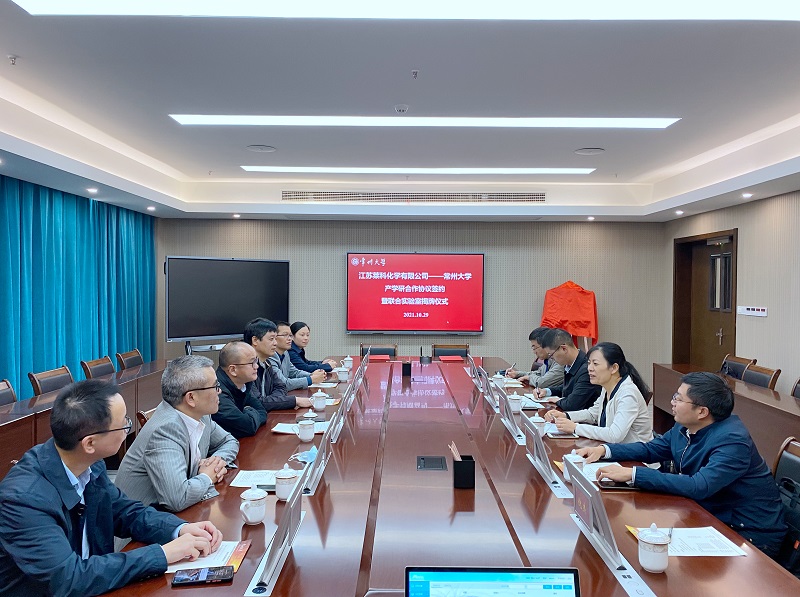 2021年10月29日,江蘇萊科化學(xué)有限公司-常州大學(xué)產(chǎn)學(xué)研合作協(xié)議簽約暨聯(lián)合實(shí)驗(yàn)室揭牌儀式在常州大學(xué)測試實(shí)驗(yàn)樓A座1507會議室舉行。江蘇萊科化學(xué)有限公司董事長朱旭東、高級顧問楊建元、副總經(jīng)理劉建超、總工程師周月根及相關(guān)高層人員,常州大學(xué)石油化工學(xué)院 食品學(xué)院院長鐘璟、副院長、催化協(xié)同中心副主任錢俊峰,聯(lián)合化學(xué)反應(yīng)工程研究所常州大學(xué)分所所長王龍耀、高級工程師吳衛(wèi)忠及學(xué)院成員參加會議。錢俊峰主持成立大會暨揭牌儀式。 會上,鐘璟代表石油化工學(xué)院 食品學(xué)院致歡迎辭,就學(xué)院整體發(fā)展情況,結(jié)合學(xué)科建設(shè)、科研優(yōu)勢、師資隊(duì)伍和學(xué)生就業(yè)等方面做了詳細(xì)介紹。