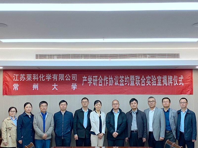 朱旭東代表江蘇萊科化學(xué)有限公司對常州大學(xué)長期以來關(guān)心、支持企業(yè)發(fā)展的各位領(lǐng)導(dǎo)、專家表示衷心感謝,期待通過校企合作,依托常州大學(xué)的學(xué)科、科研優(yōu)勢,形成長期戰(zhàn)略合作關(guān)系、創(chuàng)新校企合作模式,促進(jìn)科技成果的轉(zhuǎn)化落地,支撐企業(yè)可持續(xù)發(fā)展。 隨后,雙方代表簽訂產(chǎn)學(xué)研合作協(xié)議、共同為聯(lián)合實(shí)驗(yàn)室揭牌、合影留念,并參觀了重點(diǎn)實(shí)驗(yàn)室。