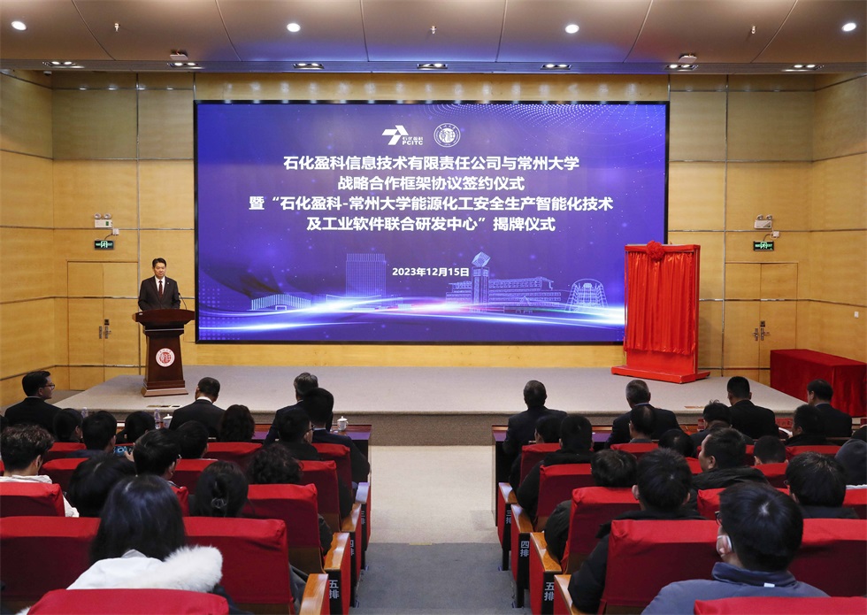 12月15日,石化盈科信息技術(shù)有限責任公司(以下簡稱“石化盈科”)與常州大學戰(zhàn)略合作框架協(xié)議簽約儀式暨“石化盈科-常州大學能源化工安全生產(chǎn)智能化技術(shù)及工業(yè)軟件聯(lián)合研發(fā)中心”(以下簡稱“聯(lián)合研發(fā)中心”)揭牌儀式在常州大學科教城校區(qū)文彰樓報告廳舉行。石化盈科董事長、黨委書記周昌,黨委委員、副總裁張劉軍,常州大學黨委書記徐守坤,原黨委書記陳群,黨委副書記、校長陳海群,副校長晏成林出席活動。石化盈科人力資源部、企改法律部、華東區(qū)域分公司、科技信息部、過程控制事業(yè)部,常州大學相關(guān)職能部門和學院負責人、教師和學生代表參加活動。陳海群主持活動。