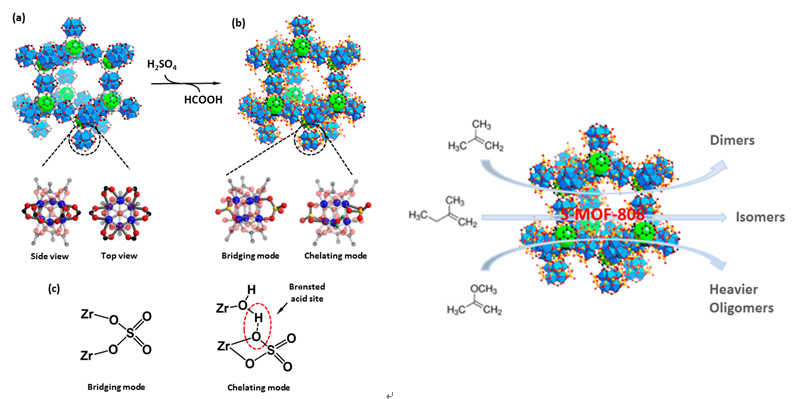 近日,我室劉平副教授在化學(xué)與材料國際頂級(jí)刊物Journal of the American Chemical Society(JACS)上發(fā)表全文研究論文。該工作首次系統(tǒng)地報(bào)道了低溫常壓下輕質(zhì)烯烴在具有超強(qiáng)Br?nsted酸位的MOF-808上的低聚反應(yīng)。揭示了MOF-808上單一烯烴低聚及不同烯烴交叉耦聯(lián)的反應(yīng)機(jī)理。同時(shí)對(duì)催化劑的失活及再生進(jìn)行了詳細(xì)研究,進(jìn)一步證實(shí)了硫酸處理的MOF-808的超強(qiáng)酸位來源于吸附的水分子與螯合在單個(gè)Zr原子上的硫酸基團(tuán)形成的氫鍵。因高溫脫水失活的催化劑經(jīng)簡單的水蒸氣處理即可完全再生。該工作為改進(jìn)商業(yè)催化劑(分子篩受限的酸強(qiáng)度及樹脂非均一的孔道結(jié)構(gòu))提供新思路,并為新型MOF材料在石油化工行業(yè)的應(yīng)用提供新途徑。 Journal of the American Chemical Society是國際化學(xué)與材料領(lǐng)域的頂級(jí)期刊,由美國化學(xué)會(huì)創(chuàng)辦于1879年,目前的影響因子為14.695。